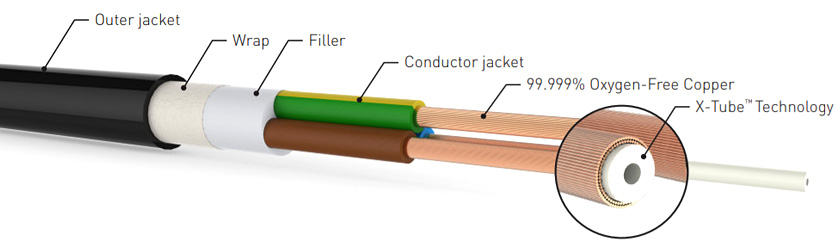 Pojedyncze plecione rdzenie w przewodach fazowym i neutralnym są na tyle małe, że nie są podatne na prądy wirowe generowane przez sąsiednie rdzenie, co ogranicza wpływ efektu zbliżeniowego. Dzięki temu, że poszczególne przewody są skutecznie odizolowane od siebie, starannie dobrana częstotliwość skrętu żył sprawia, że żadne dwa przewodniki nie pozostają w konfiguracji równoległej dłużej niż kilka milimetrów. To dodatkowo poprawia równomierny przepływ prądu przez kabel we wszystkich zakresach częstotliwości.