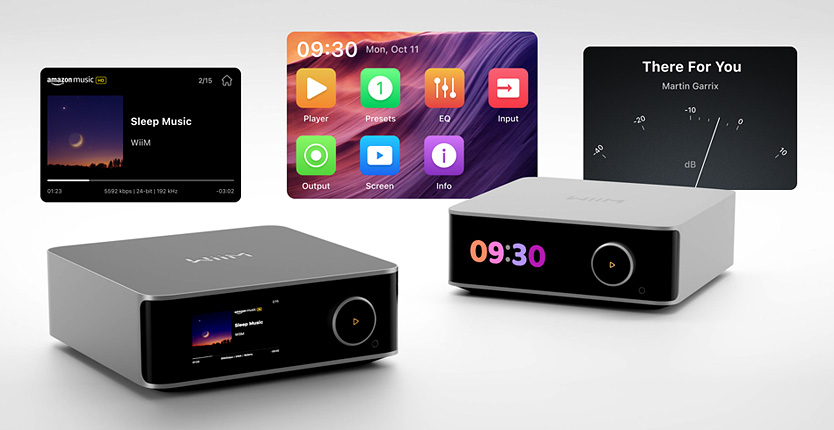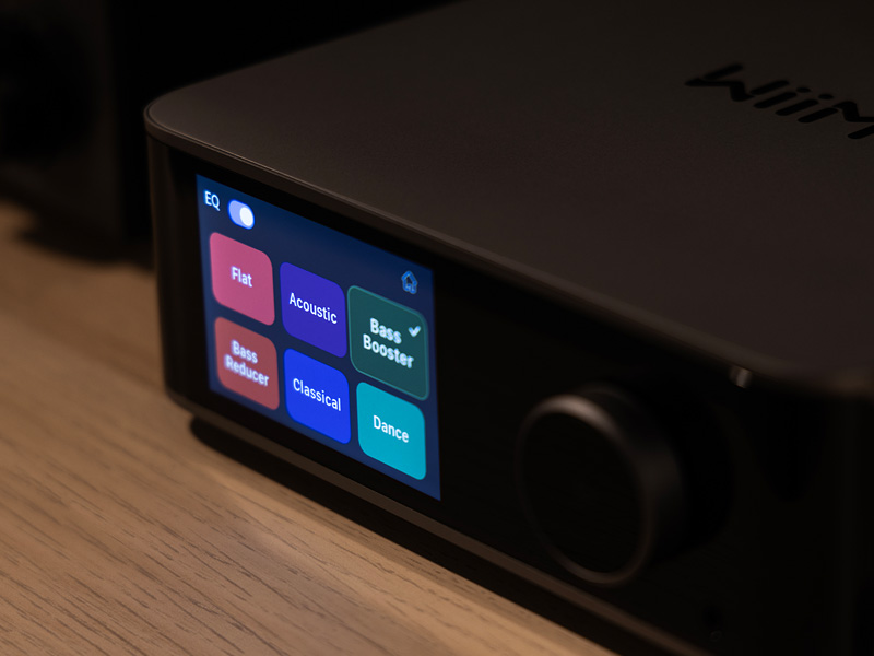 WiiM Ultra wyposażony został w jasny 3,5" wyświetlacz dotykowy, który prezentuje duże okładki albumów, wskaźnik VU, natychmiastowe informacje zwrotne, odtwarzanie muzyki oraz inne ekrany. Ułatwia to nawigację między wejściami, wyjściami i ustawieniami, zapewniając płynne i bardziej przyjazne doświadczenie oraz natychmiastową wizualną informację zwrotną na działania użytkownika.