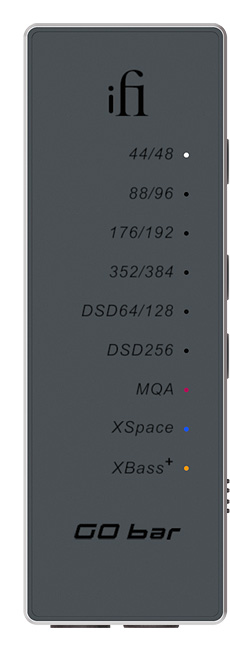 Większość przenośnych DAC/AMP-ów USB zapewnia niewielką kontrolę głośności lub jej brak, a głośność można regulować tylko za pomocą urządzenia źródłowego. GO bar jest inny, jego inteligentna aluminiowa obudowa ma fizyczne przyciski do precyzyjnej regulacji głośności. Kolumna kolorowych diod LED zapewnia informacje o formacie i częstotliwości próbkowania aktualnie odtwarzanego formatu oraz czy włączone są XBass+ i/lub XSpace.