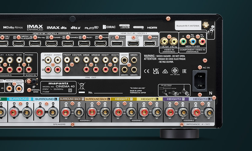 CINEMA 40 to wydajny amplituner audio/video, stworzony zarówno do pomieszczeń wielofunkcyjnych, jak również dedykowanych sal kina domowego. Wyposażony został legendarny wzmacniacz Marantz pracujący w klasie A/B o mocy 9x 125 W, siedem wejść HDMI, z których każde obsługuje treści 8K UHD, bezprzewodową platformę streamingową HEOS® Built-In, korekcję akustyki pomieszczenia Audyssey MultEQ XT32, Dolby Atmos i DTS:X, Auro 3D oraz wiele innych wejść i wyjść, w tym wyjścia przedwzmacniacza dla wszystkich kanałów i obsługę czterech niezależnych subwooferów.