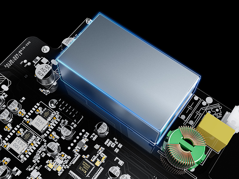Wielotorowa konstrukcja obejmuje 18 niskoszumowych stabilizatorów LDO oraz 5 przetwornic DC-DC, które dostarczają czystą, stabilną energię do każdego z segmentów układu. Zastosowane kondensatory klasy audiofilskiej - elektrolity ELNA RA3 - z jedwabną folią oraz specjalistyczne kondensatory tantalowe - zapewniają ciepłe, stabilne brzmienie i wysoką niezawodność działania.