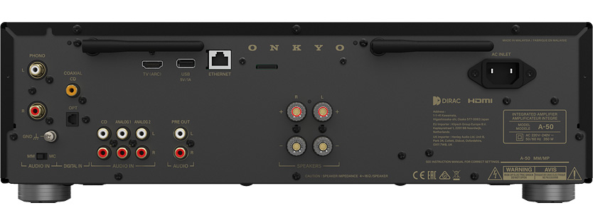 Podłącz gramofon, odtwarzacz CD i z łatwością przesyłaj muzykę dzięki szerokim możliwościom łączności wzmacniacza Onkyo A-50. Trzy pary wejść RCA, HDMI ARC, wejście gramofonowe MM/MC, wejście koncentryczne, USB-A, optyczne oraz wyjście słuchawkowe zapewniają pełną elastyczność podłączeń.
